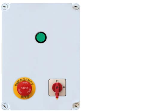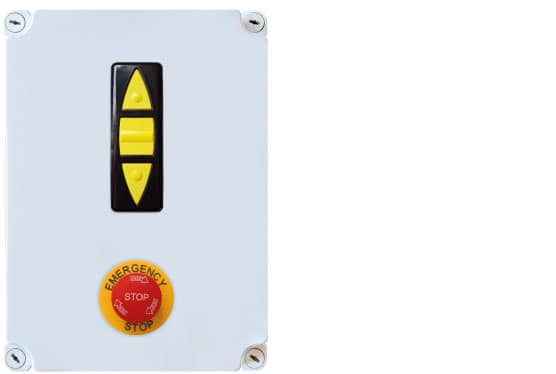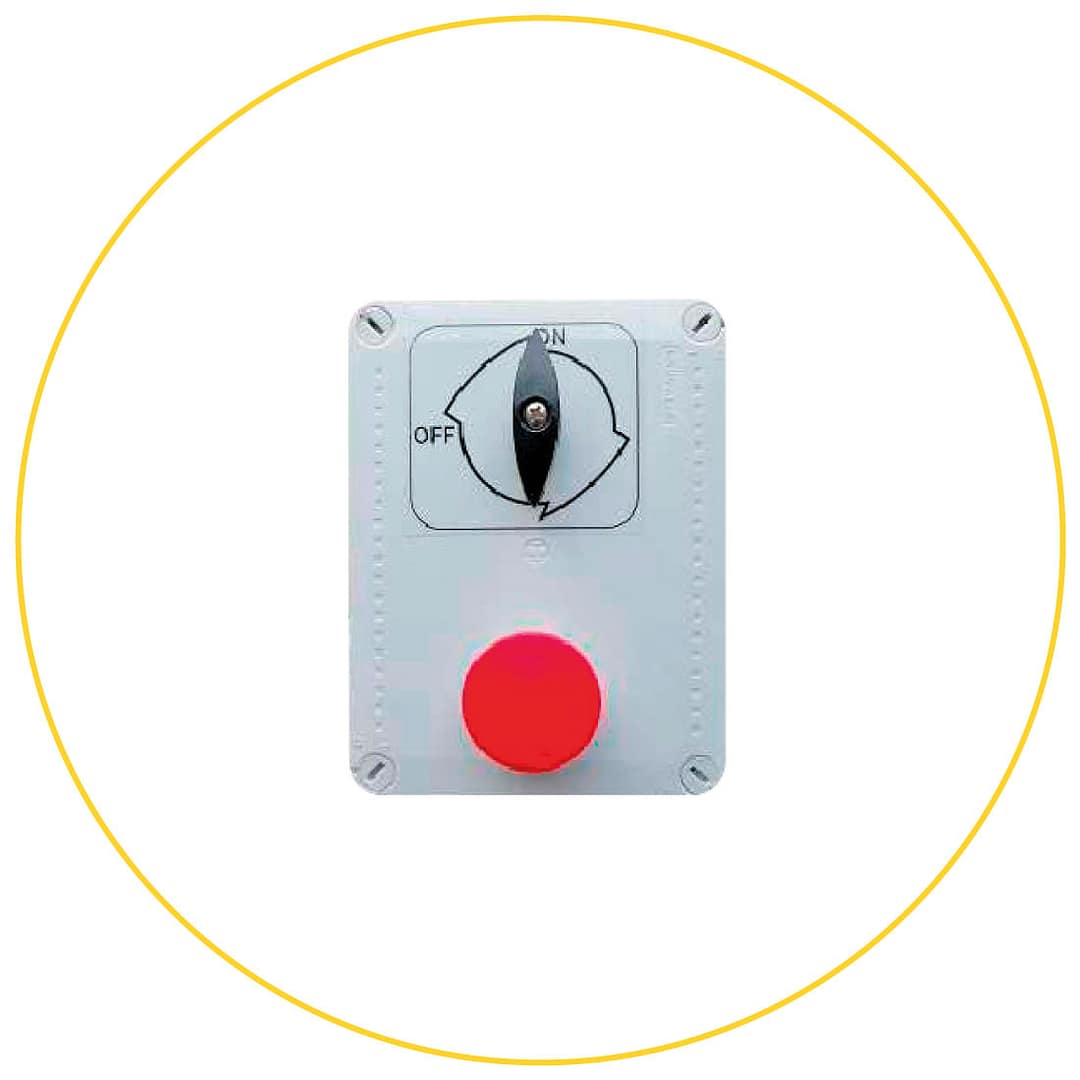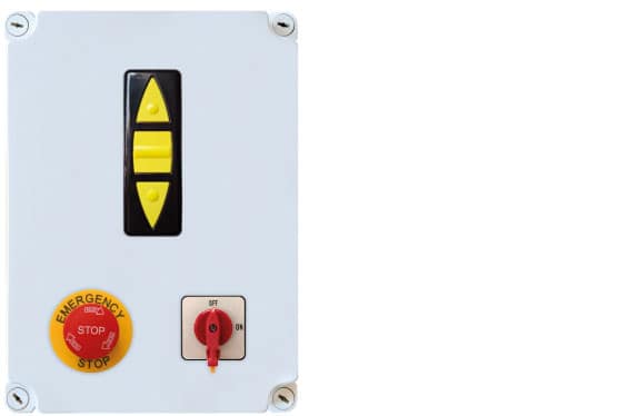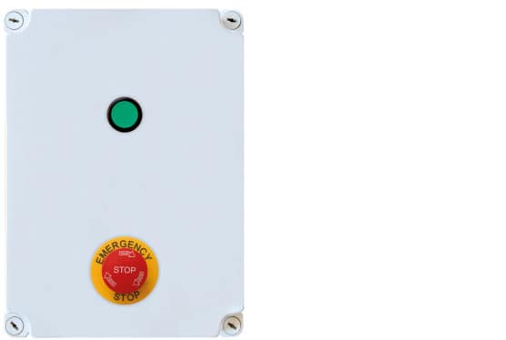 Dispositivo di comando con interruttore a due posizioni e stop di emergenza.